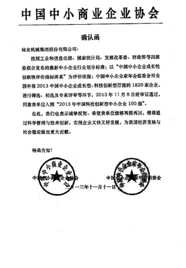 绿友荣获“2013年中国科技创新型中小企业100强” 确认函: