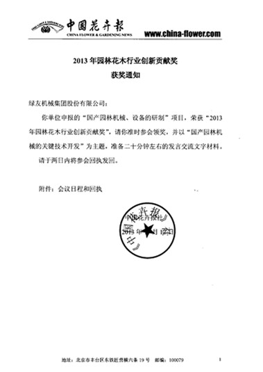 绿友集团申报的“国产园林机械、设备的研制”项目获得了“2013年园林花木行业创新贡献奖”。该奖将在11月23日江西南昌举办的“2013中国园林花木行业创新大会暨聚焦江西千亿花木产业发展高峰论坛”上进行颁发,届时将有以“国产园林机械的关键技术开发”为主题的发言。