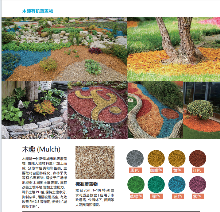 有机覆盖物:是利用各种有机生物体材料,通过各种生产工艺,加工处理后铺设于园艺植物或树木周围的土壤表面,起保持土壤水 分、吸附扬尘、调节土壤温度、增加土壤肥力、抑制杂草、促进植栽生长、减少土壤侵蚀和紧实度以及装饰美观等等作用。(如下图)
