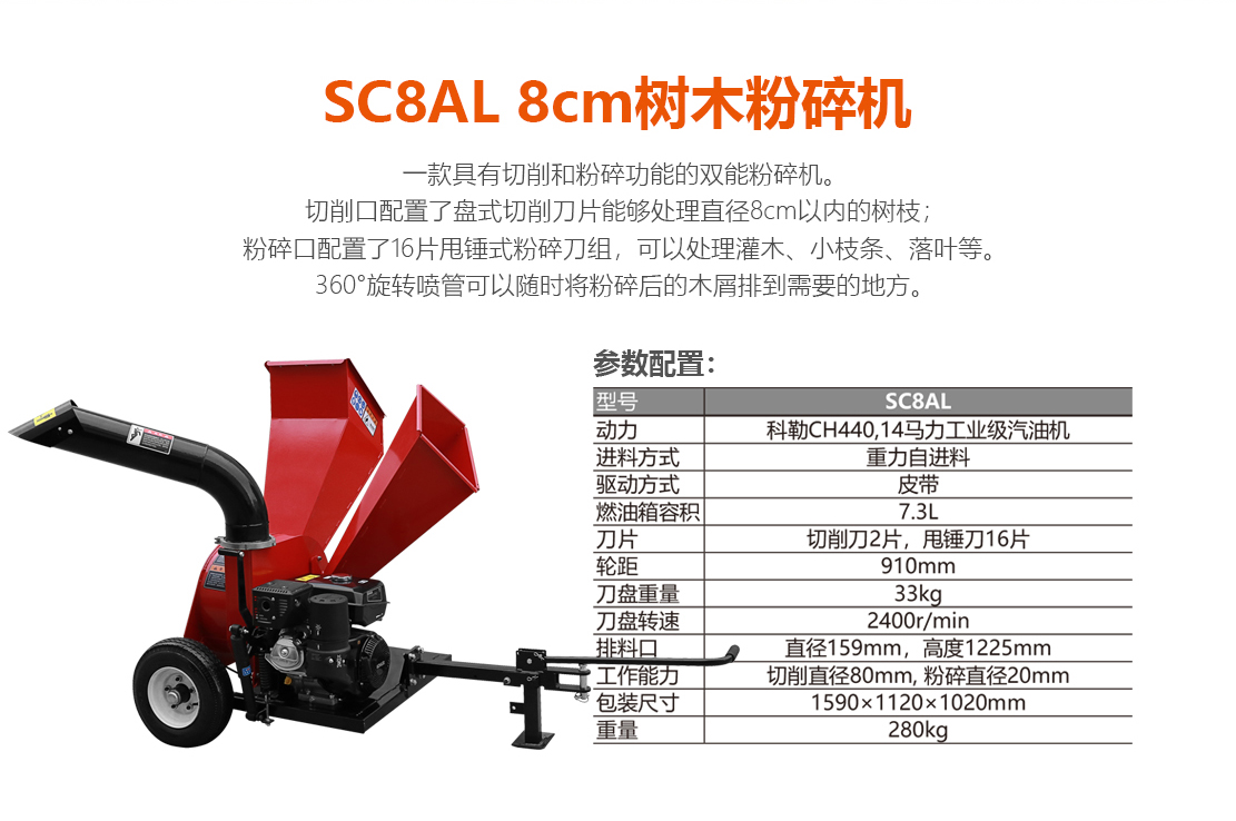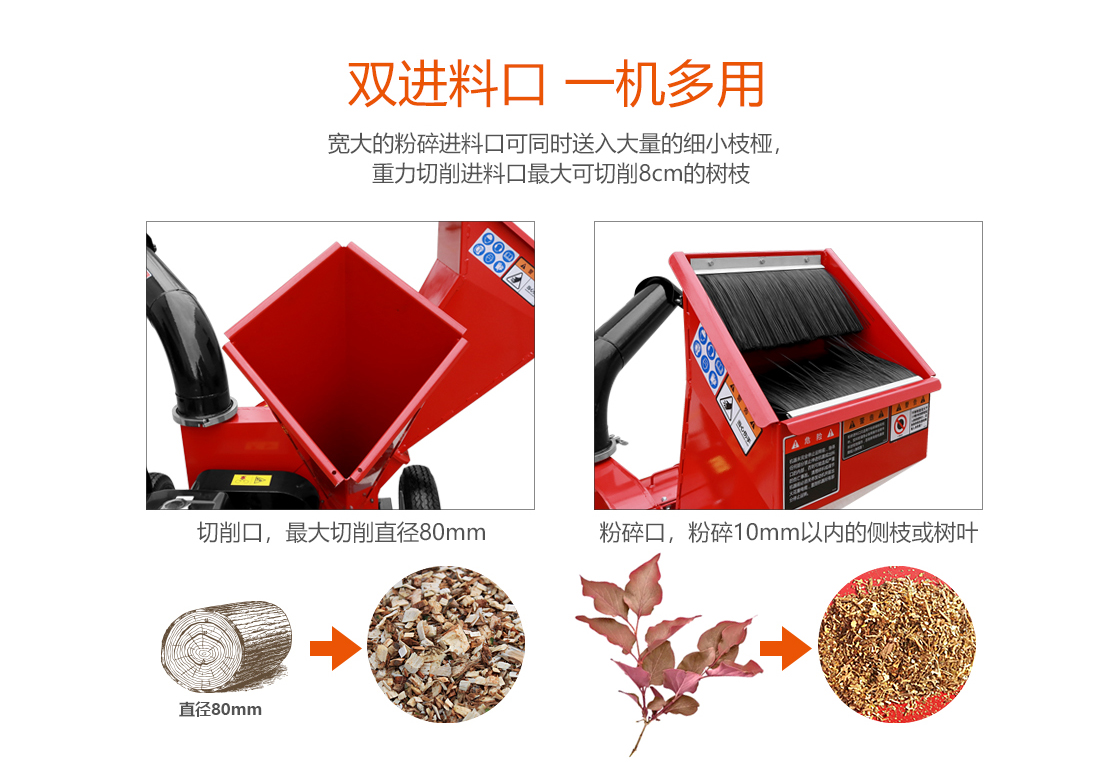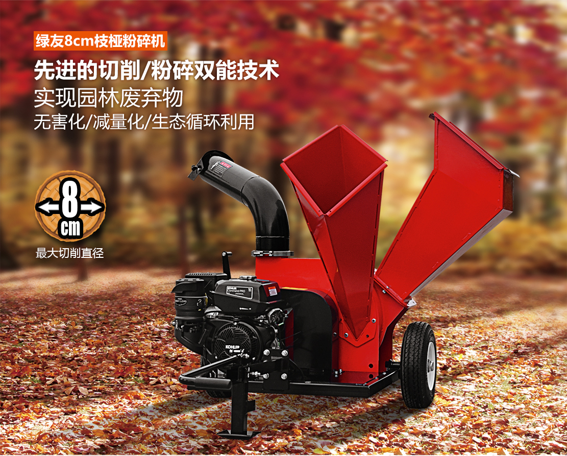 绿友小粉碎机是一款径向进料系统的商用小型粉碎机,其宽大的粉碎进料口可同时送入大量的细小枝桠,重力切削进料口最大可切削8cm的树枝,360度旋转出料口更方便收集及清理。