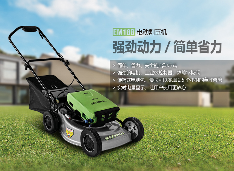18寸电动草坪修剪机,实现了草坪修剪的电动化,具有噪音低,无污染, 操作简单,适用于社区、学校、单位等场所使用。