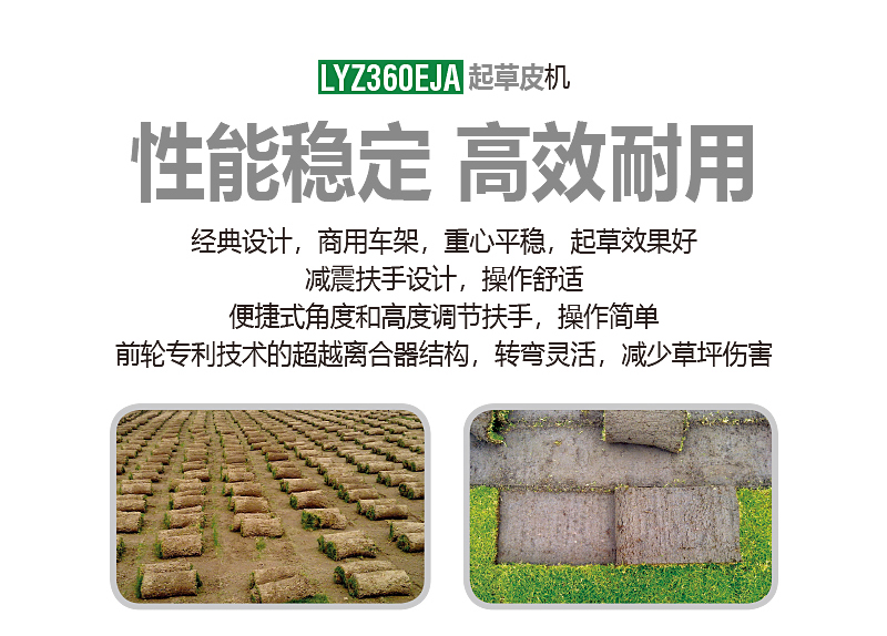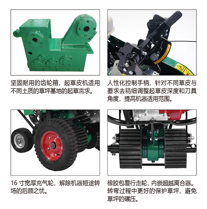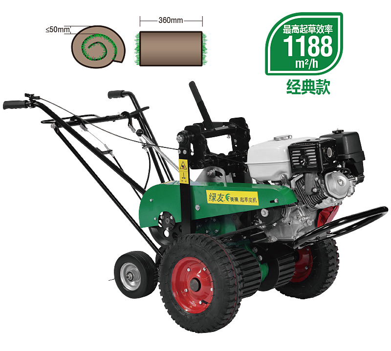 美神起草皮机根据人体工程学原理,改进了操作方式,扶手增加减震,后轮为万向轮并配有超越离合器,转弯方便且不损坏草坪,增加了操作者舒适度。本产品可根据不同草种和不同状态草皮随意调整起草的深度、角度,效率高。