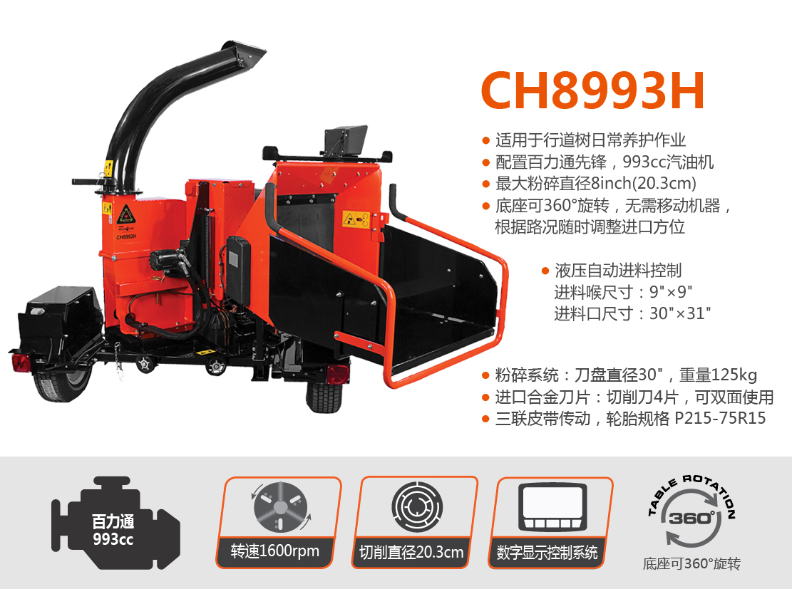 老熊(BEARCAT)品牌树枝粉碎机,配置百力通先锋993cc发动机,最大可切削直径20cm树枝。