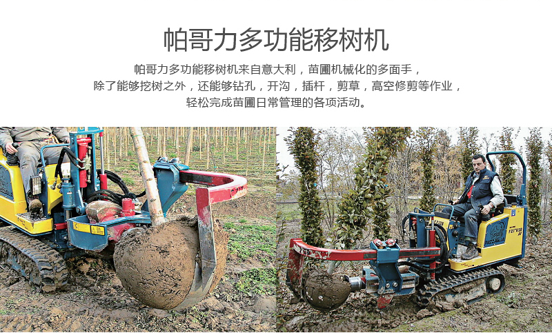 来自意大利的帕哥力多功能移树机,是苗圃机械化的多面手,除了能够挖树之外,还能够钻孔,开沟