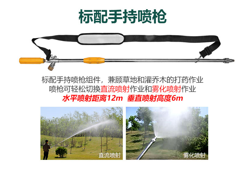 √ 配高压喷枪,可用于灌木、树木的打药作业,也可用于清理小广告、灰尘等。
