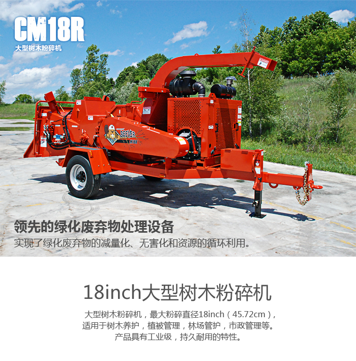 大型树木粉碎机,最大粉碎直径18inch(45.72cm),适用于树木养护,植被管理,林场管护,市政管理等。产品具有工业级,持久耐用的特性。